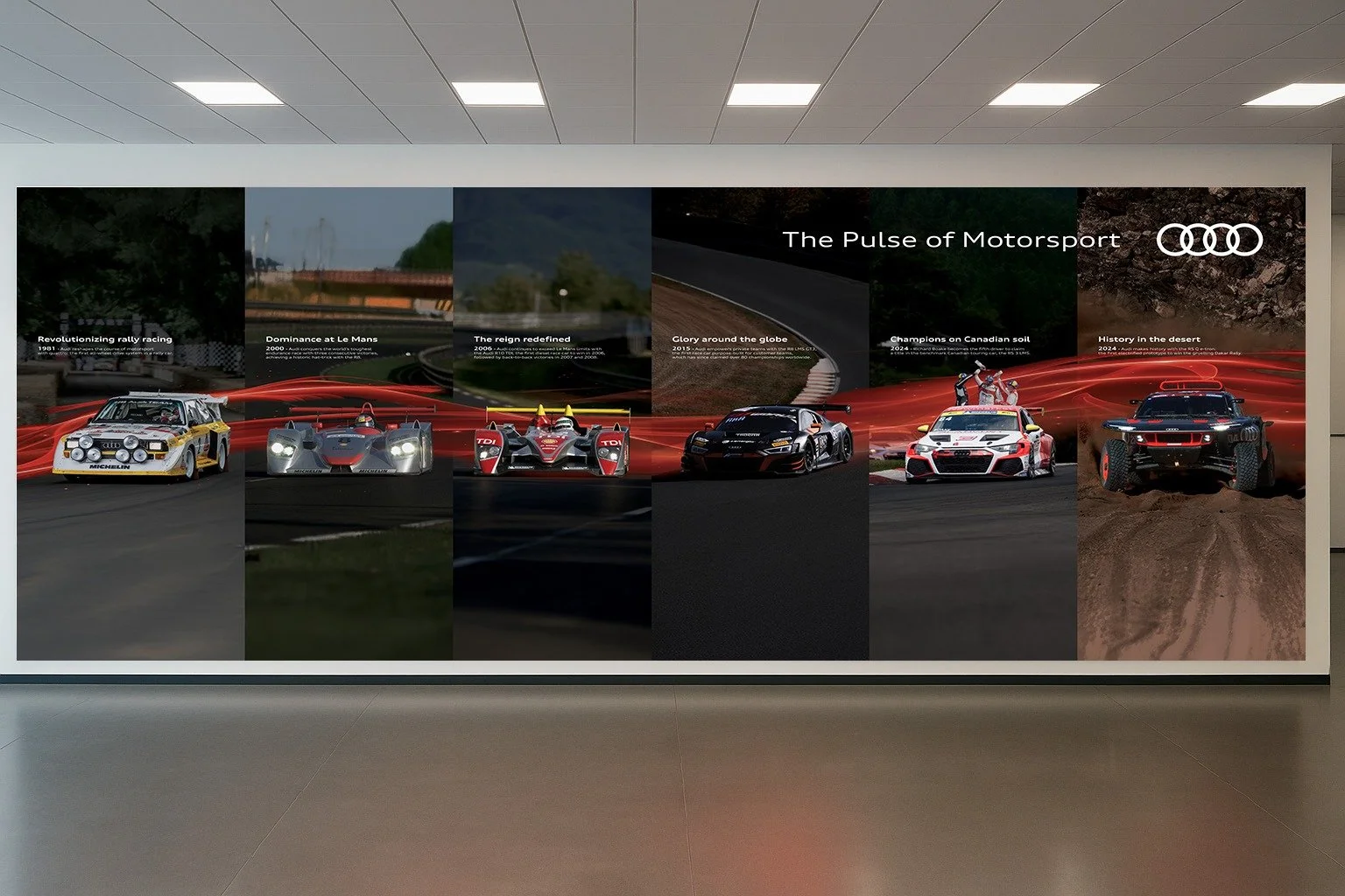 A massive wall graphic served as the centerpiece of an activation, illustrating Audi’s motorsport journey from the 1980s through to today. Designed as a chronological visual narrative, the wall connected past achievements to Audi’s future in Formula 1, reinforcing credibility, legacy, and long-term commitment to the sport at scale.